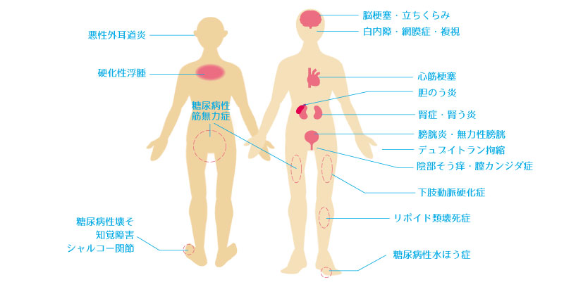 血糖値が高いままの生活を続けると、全身の血管がもろく、ボロボロになってしまう病気です。全身の細胞の機能も低下し感染に対しても抵抗力がなくなり肺炎、尿路感染、歯周病等も引き起こします。前述した合併症以外にも全身にいろんな障害が起こってきます。(下図参照)