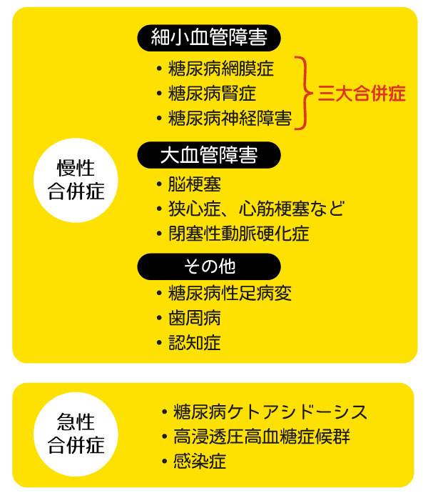 多くの場合(軽症の場合)には高血糖に伴う症状(口渇、多飲、多尿、体重減少など)がないことが多いです。しかしながら、血糖が異常に高く重篤な場合には昏睡(糖尿病ケトアシドーシス、高浸透圧高血糖症候群)に陥ることもあります。自覚症状が無くても、血糖値が高い状態が続くと、気づかないうちに全身の血管が障害され、さまざまな合併症が起こります。糖尿病特有の細小血管合併症が出現します。代表例が網膜症、腎症、神経障害の「三大合併症」です。網膜症は失明に、腎症は腎不全引いては人工透析の必要な状態に、神経障害は足先などの痺れ、麻痺、壊疽が起こすこともあります。また大血管障害(動脈硬化)が促進され、心筋梗塞、脳梗塞、壊痘、下肢閉塞性動脈硬化症の発症もよく見られます。