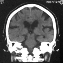 特発生正常圧水頭症の特徴的CT所見(通常は脳を水平に撮影しますが、冠状に撮影した画像のほうがより特徴を捉えることができます)
