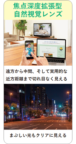 多焦点眼内レンズには、遠方・近方に焦点が合う2焦点眼内レンズ、中間にもピントが合うようになった3焦点眼内レンズがあります。眼鏡やコンタクトレンズの装用ができない方や、眼鏡をかける頻度を減らしたい方には好ましいと言われています。