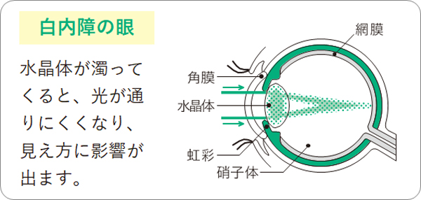 目の中でレンズの役割をする水晶体が濁り、十分に光を通さなくなるため、見えにくくなる疾患です。