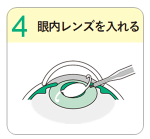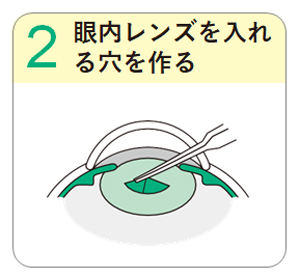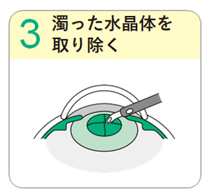濁った水晶体を砕いて取り出し、その代わりに人工の水晶体である眼内レンズを入れる手術です。