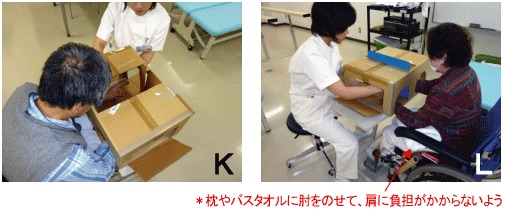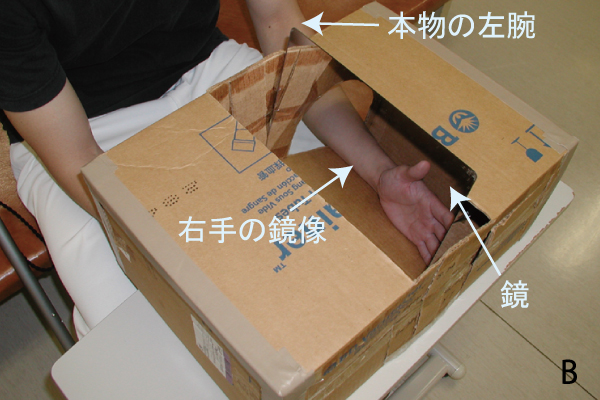 楽な姿勢で座れる状態で、身体の正面中央付近に適切な大きさの「鏡」を設置します。当院では廃品ダンボール箱を「ミラーボックス」として利用しています。