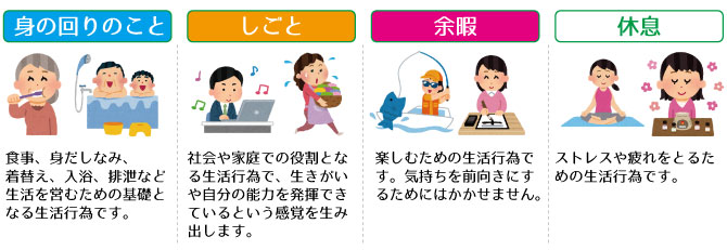 「身の回りのこと」をすることは大切ですが、週7日、朝から夜まで身の回りのことだけをしていると、なんのために生きているのかな?と気持ちが落ち込んでくるはずです。ですから自分の能力を発揮して、誰かの役にたっているいう感覚を生み出すために「働いたり、何かを生み出すこと」も必要です。しかし、週7日働いてばかりだと、うつになり、過労死してしまいます。かならず「休むこと」が必要です。かといって、「休むこと」が多すぎると、筋肉や体のあちらこちらが衰えてきてしまいます。