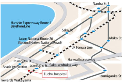 - From “Izumi-Otsu station” on the Nankai Main Line: Take a Nankai bus for Chichioni or Izumi-Otsu Komyoike and alight at the “Izumi-Fuchu Ekimae” bus stop. The hospital is 3 minutes’ walk away.