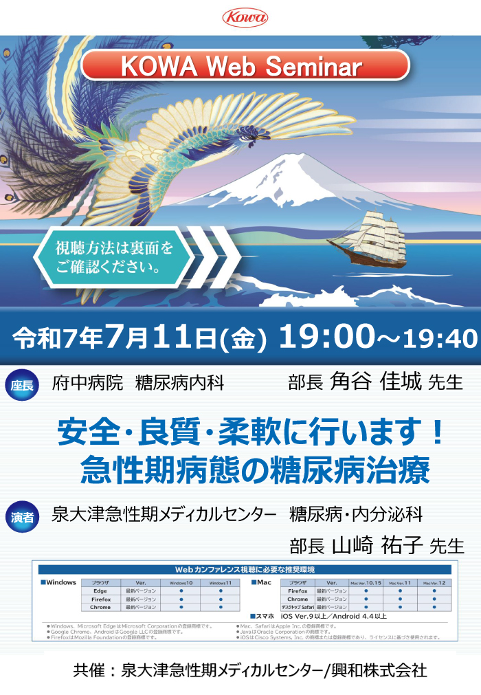 イベント・セミナー 医療関係の方向け 終了 薬局研修会 202602/28 土 15:00~16:30 第1回 泉州薬薬連携研修会 開催 終了 セミナー 202507/11 金 19:00~19:40 KOWA Web Seminar「安全・良質・柔軟に行います! 急性期病態の糖尿病治療」 府中病院 糖尿病内科 部長 角谷 佳城先生 泉大津急性期メディカルセンター 糖尿病・内分泌科 部長 山崎 祐子先生 イベント・セミナー 一般・患者さん向け すべて 市民講座 イベント 医療関係の方向け すべて セミナー 薬局研修会