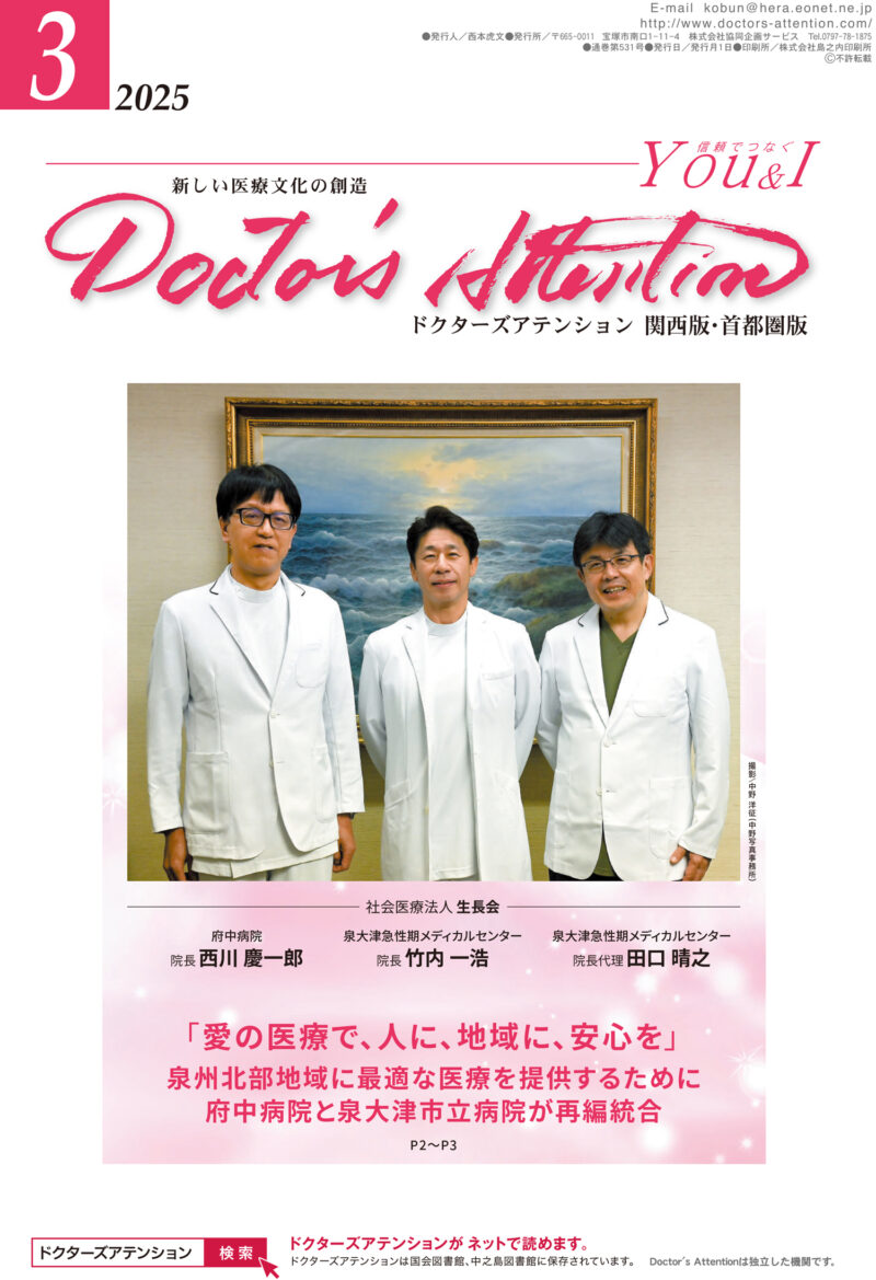 2025.03.12 一般・患者さん向け メディアでの紹介 ドクターズアテンションにインタビュー記事が掲載されました ドクターズアテンション(2025年3月号)に府中病院 西川院長と泉大津急性期メディカルセンター 竹内院長・田口院長代理のインタビュー記事が掲載されています。府中病院と泉大津市立病院の再編統合の経緯や、再編統合後の両病院の機能についてお話ししています。 インタビュー記事はこちら 一覧を見る お知らせ 一般・患者さん向け すべて お知らせ 休診情報 予防接種 メディアでの紹介