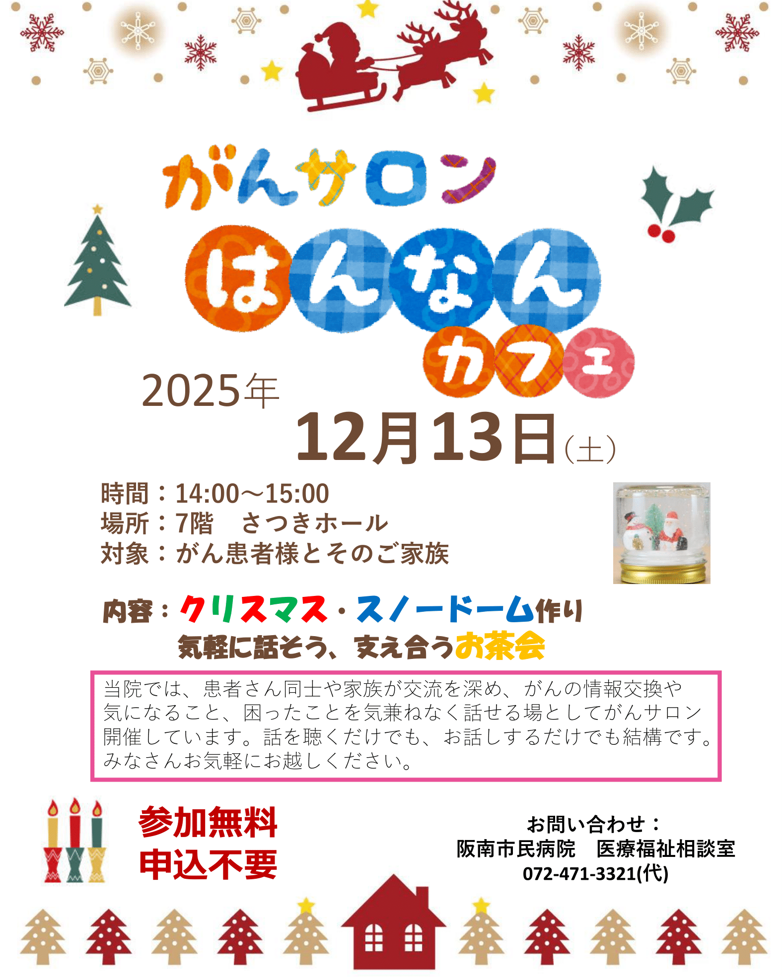 2025.11.28 一般・患者さん向け 開催予定 がんサロン はんなんカフェ 日時 2025.12/13 土 14:00~15:00 会場 社会医療法人生長会 阪南市民病院 7階 さつきホール 費用 無料 申込 不要 当院では、患者さん同士や家族が交流を深め、がんの情報交換や気になること、困ったことを気兼ねなく話せる場としてがんサロンを開催しています。話を聞くだけでも、お話するだけでも結構です。みなさんお気軽にお越しください。 日時 2025年12月13日(土)14:00~15:00 開催場所 〒599-0202 大阪府阪南市下出17社会医療法人生長会 阪南市民病院 7階 さつきホール 対象 がん患者様とそのご家族様 内容 ・クリスマス、スノードーム作り・気軽に話そう、支え合うお茶会 お問い合わせ 阪南市民病院 医療福祉相談室 072-471-3321(代表) 一覧を見る イベント・セミナー 一般・患者さん向け すべて 市民講座 がんサロン イベント 医療関係の方向け すべて セミナー イベント