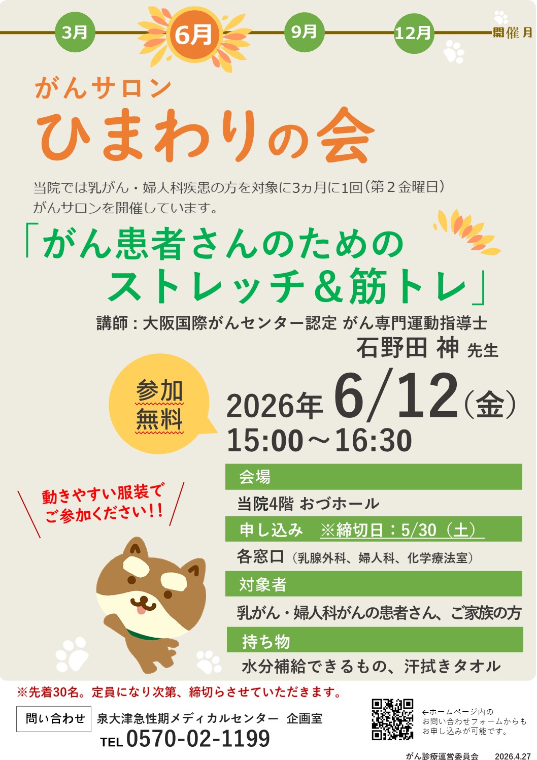 受付中 「がん患者さんのためのストレッチ&筋トレ」 がんサロン ひまわりの会