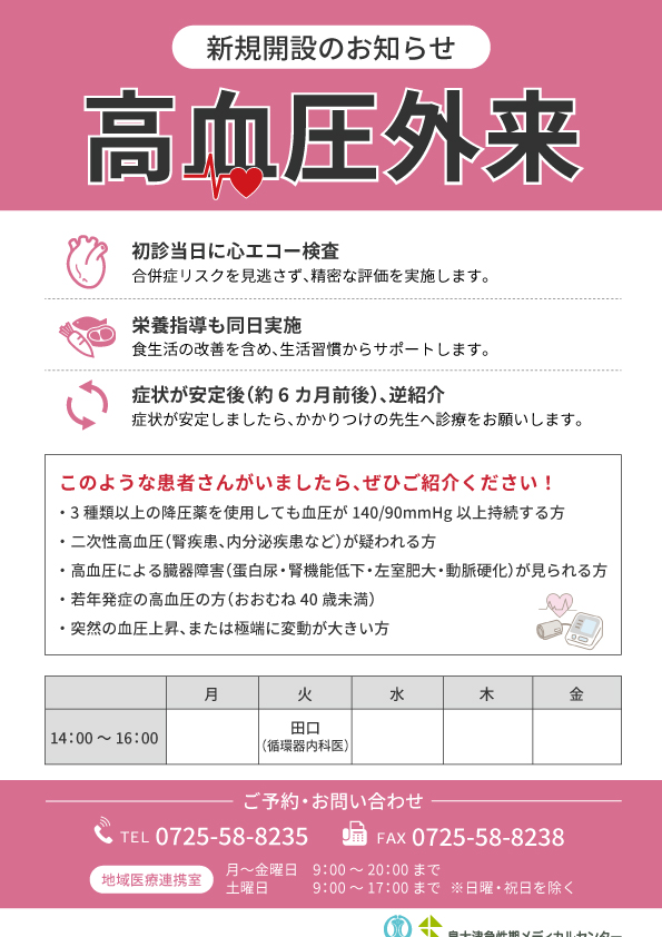 2025.10.01 医療関係の方向け お知らせ 「高血圧外来」を新規開設しました! PDF(162KB) 「循環器内科・冠疾患内科」の紹介ページはこちら 患者さんの紹介方法ページはこちら 一覧を見る お知らせ 一般・患者さん向け すべて お知らせ 休診情報 メディアでの紹介 医療関係の方向け すべて お知らせ 採用情報 すべて お知らせ 説明会・見学会 臨床研修