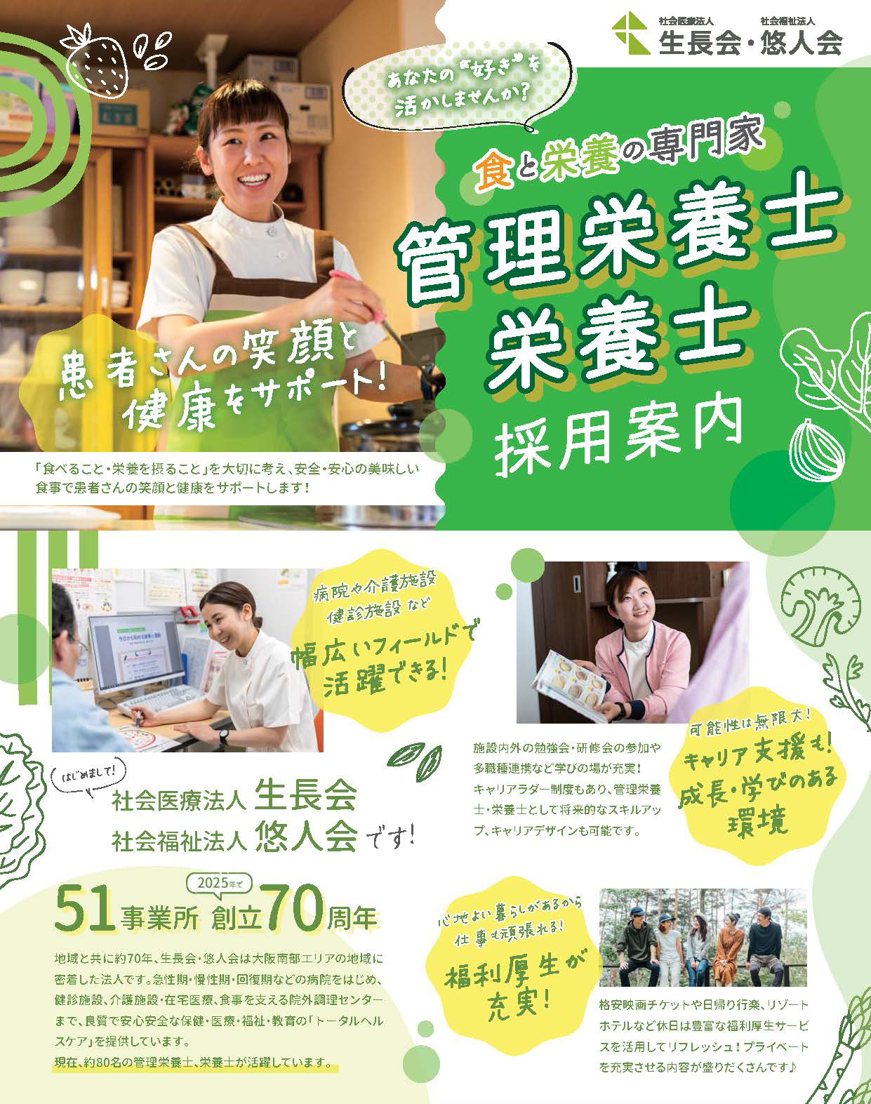 生長会・悠人会は大阪南部エリアの地域に密着した法人です。健診事業から急性期・慢性期・回復期医療、食事を支える院外調理センター、介護や在宅医療まで、広範囲にわたる保健・医療・福祉の総合的なヘルスケア体制を担い、現在約80名の管理栄養士、栄養士が活躍しています。