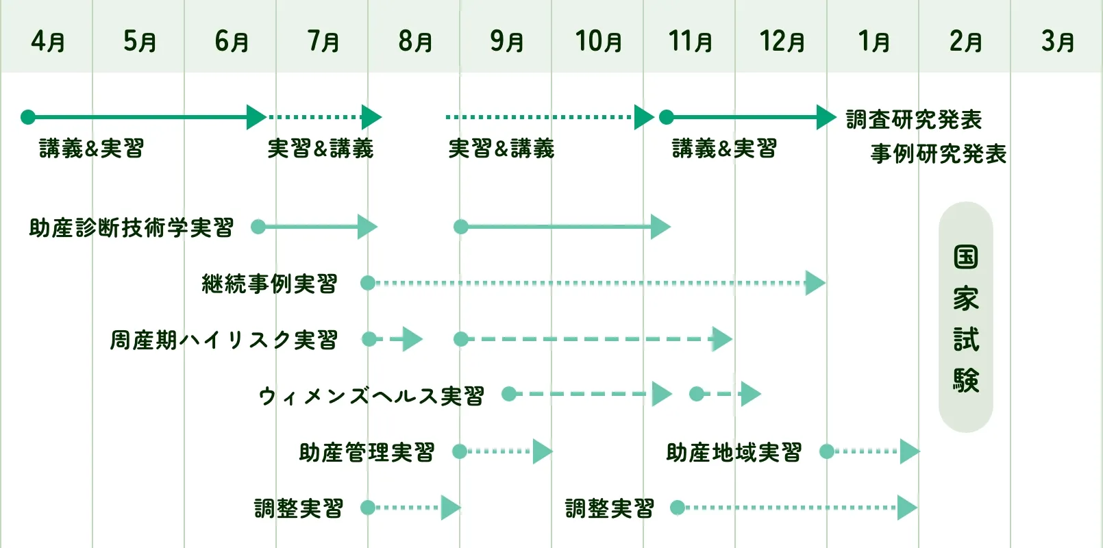 助産師国家試験受験資格、受胎調節実地指導員申請資格、新生児蘇生法(一次コース)認定が取得可能です。