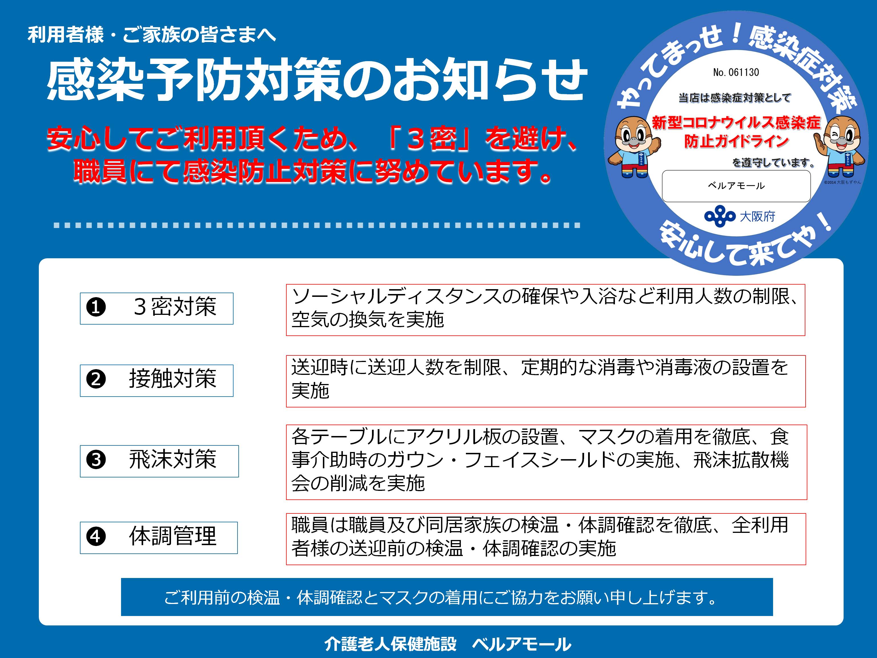 ベルアモールは大阪府のガイドラインを遵守し、安心して利用できる施設であることを府民の皆様に示す「感染防止宣言ステッカー」を取得しました。利用者様の安全・安心を最優先し、新型コロナウイルスの感染拡大防止に向けて、下記のような取り組みを行っております。