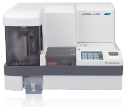 生化学免疫自動分析装置(ci16200)2台体制で、おもな生化学、免疫検査を行っています。24時間緊急対応しており、検体には血液、尿などがあります。血液は遠心機にかけると上の部分(血清)と下の部分(血球)に分かれます。その上の部分を測定します。