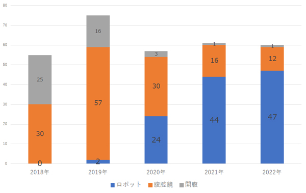 2022年の胃がん手術のうち、その98%がロボット手術であり、大阪府下でも有数の手術件数でした。
