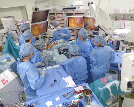 体に対して負担の軽い腹腔鏡下大腸切除手術を原則としています。傷が小さいだけでなく、病変部に近接した画像によって(図)詳細な解剖(血管、神経やリンパ管)を認識でき、出血が少なく、最小限のダメージで病巣を切除することができると考えています。内視鏡外科学会技術認定医を中心に安全性を最大限に優先させ、質の高い腹腔鏡下手術を行っています。