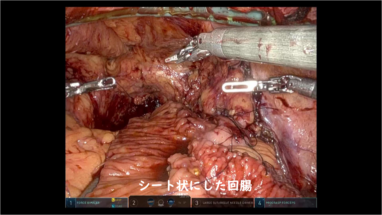 おなかに操作用のポートを6つ開け(傷の大きさはカメラ挿入部が2cmで、他は1cm程度です)手術を行います。尿路変更の為に、腸管を切り出す操作に関しては、小切開(カメラ挿入部の傷を5㎝程度まで広げる)をおいて行います。