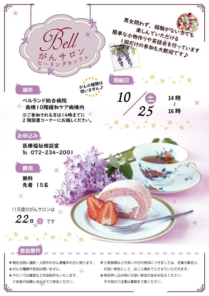 2025.10.25 一般・患者さん向け 開催予定 がんサロン-ベル・ヒーリングカッフェ 日時 2025.10/25 土 14:00~16:00 会場 ベルランド総合病院 南棟10階緩和ケア棟内 定員 15名 費用 無料 申込 医療福祉相談室 開催案内 男女問わず、経験がない方でも楽しんでいただける簡単な小物作りや茶話会を行っています。1回だけの参加も大歓迎です♪ 開催日時 2025年10月25日(土)14時~16時 開催場所 ベルランド総合病院南棟10階 緩和ケア病棟内※ご参加される方は14時までに2階図書コーナーへお越しください。 参加条件 ・現在当院に通院・入院中のがん療養中の方に限ります。・がんの種類や性別は問いません。・サロンでは雑貨など作品制作もいたします。ご自身の体調に合わせてご参加ください。・ご家族様など付添いの方の参加につきましては、定員の都合上、付添い参加として、お二人様までとさせていただきます。 参加申し込み時に付添い参加の旨をお伝えください。 お申込み 医療福祉相談室TEL 072-234-2001(代) がんサロン 一覧を見る イベント・セミナー 一般・患者さん向け すべて 市民講座 がんサロン イベント 医療関係の方向け すべて セミナー 薬局研修会
