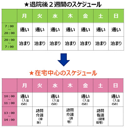 退院後すぐに在宅療養ではなく、在宅人口呼吸(NPPV)療法に慣れる為に、退院日から看多機サービスの「泊まり」を2週間利用。手技が確立されてから、「通い」を中心とした看多機サービスの調整により、在宅復帰をはかります。