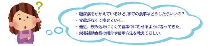 訪問栄養指導はかかりつけ医、訪問診療医の指示が必要です。在宅療養中の方で食事について困っていることがありましたら、まずは医師、ケアマネージャーへご相談ください。