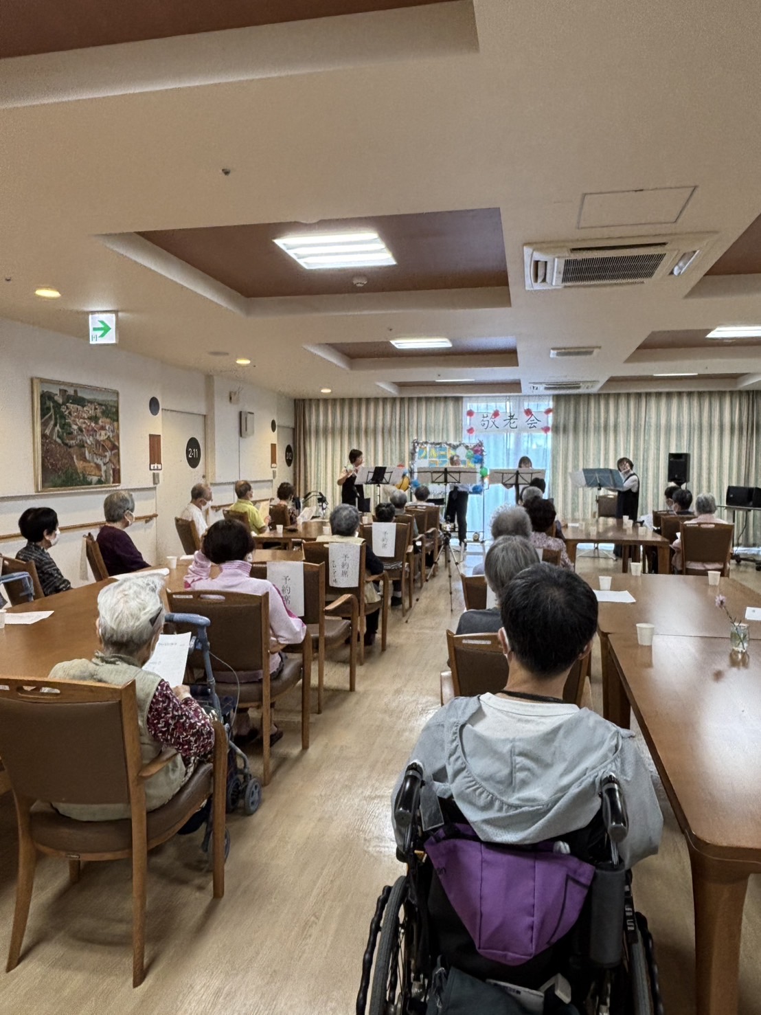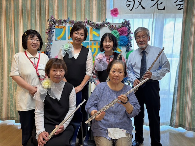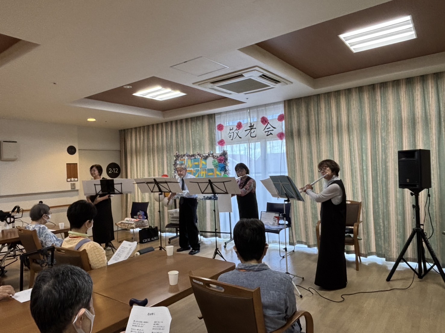 グループ名:「ペリドット」4人組のフルート教室の仲間さんです。 優しい音色のフルートの4重奏。そして、曲と曲の間のおしゃべりとがとても素敵でした。 演目曲には懐かしい曲もあり、思わず口ずさんでおられる入居者さんもおらました。