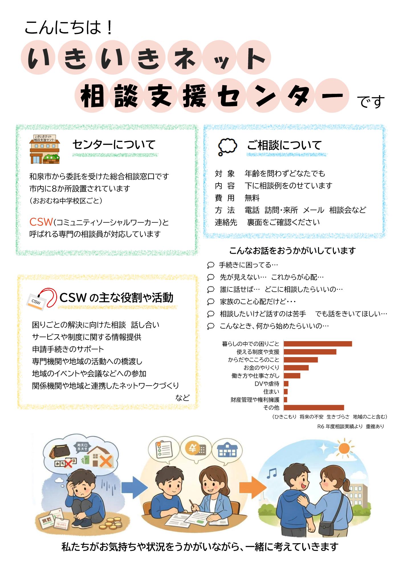 「いきいきネット相談支援センター」は、和泉市が事業委託し開設している公的な相談機関です。和泉市内8箇所に設置されており、「サンガーデン府中いきいきネット相談支援センター」では和泉中学校区にお住まいの皆さんのご相談をお受けしています。
