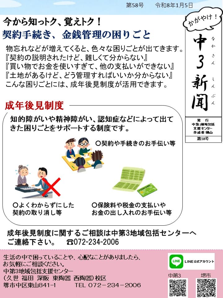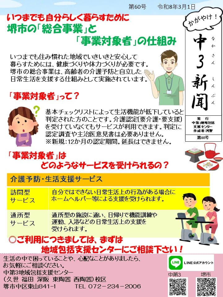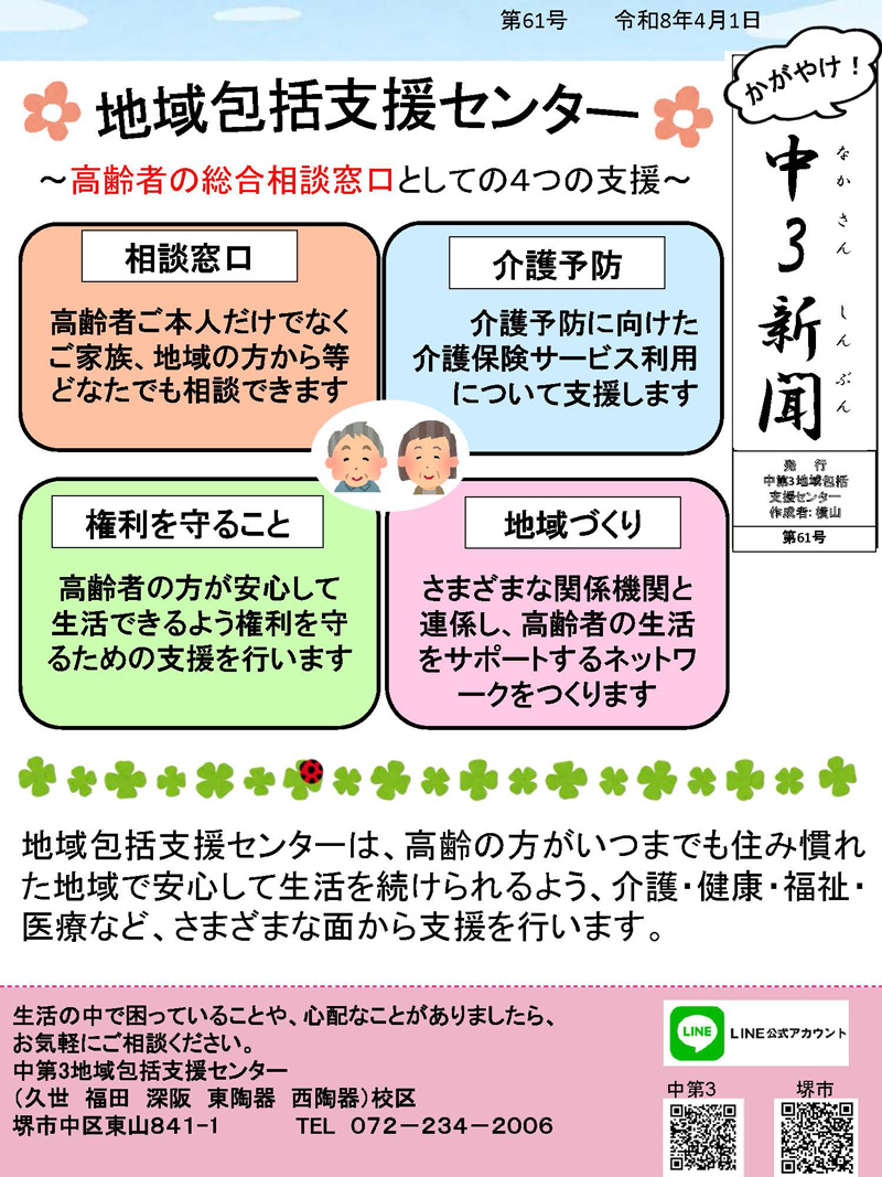 中第3地域包括支援センターでは、毎月「かがやけ!中3(なかさん)新聞」を発行し、高齢者の健康維持・増進に向けての内容や地域の情報などを、幅広く発信しています。