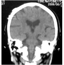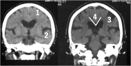 特発生正常圧水頭症の特徴的CT所見(通常は脳を水平に撮影しますが、冠状に撮影した画像のほうがより特徴を捉えることができます)