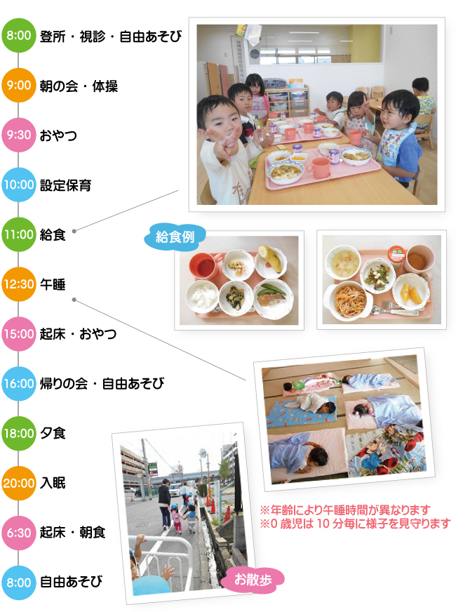 | 休日保育 | 休みの日でも入園されているお子様ならご利用が可能です。リフレッシュにご利用ください。 |