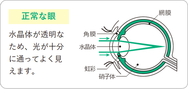 目の中でレンズの役割をする水晶体が濁り、十分に光を通さなくなるため、見えにくくなる疾患です。