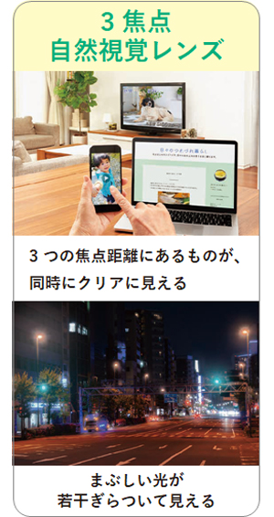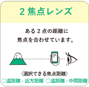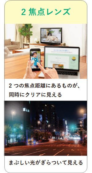 多焦点眼内レンズには、遠方・近方に焦点が合う2焦点眼内レンズ、中間にもピントが合うようになった3焦点眼内レンズがあります。眼鏡やコンタクトレンズの装用ができない方や、眼鏡をかける頻度を減らしたい方には好ましいと言われています。
