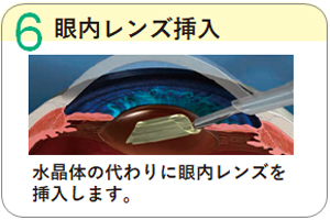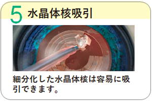 濁った水晶体を砕いて取り出し、その代わりに人工の水晶体である眼内レンズを入れる手術です。