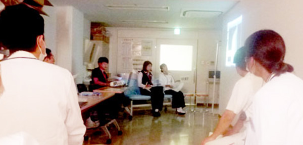 ケアマネジャーさんなどを中心として、地域の通所施設関係者、訪問看護師さんやヘルパーさんなどと当院スタッフが集まり退院前に在宅生活をイメージした話し合いを行っています。
