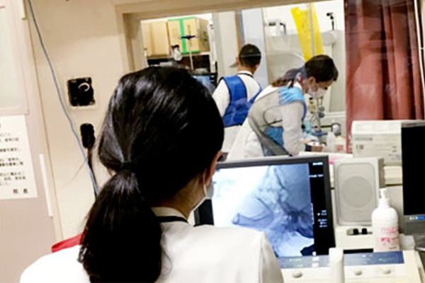 嚥下造影検査を、医師、言語聴覚士、放射線技師が連携して実施しています。