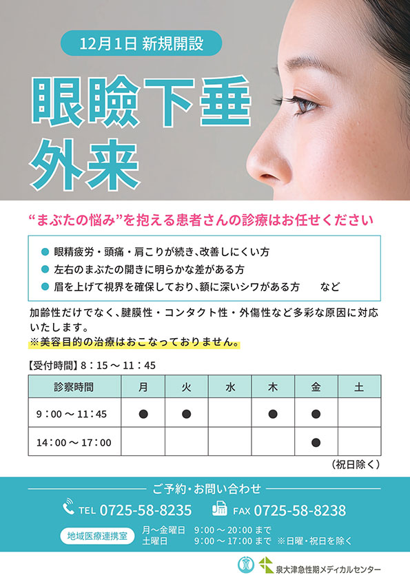 2025.12.01 医療関係の方向け お知らせ 「眼瞼下垂外来」を新規開設しました! PDF(158KB) 「形成外科」の紹介ページはこちら 患者さんの紹介方法ページはこちら 一覧を見る お知らせ 一般・患者さん向け すべて お知らせ 休診情報 メディアでの紹介 医療関係の方向け すべて お知らせ 採用情報 すべて お知らせ 説明会・見学会 臨床研修